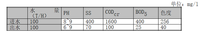 根據(jù)建設方提供的數(shù)據(jù)及相關(guān)行業(yè)的資料,出水排到附近小河。出水水質(zhì)達到《紡織染整工業(yè)污染物排放標準》GB4287-92中一級排放標準,設計進出水水質(zhì)如下: