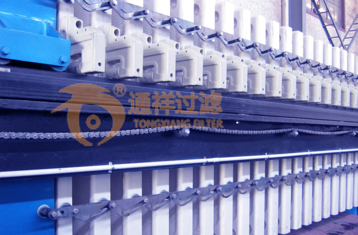 過濾部分是由按一定次序排列在主梁上的濾板、夾在濾板之間的濾布、隔膜濾板組成,濾板、濾布與隔膜濾板的相間排列,形成了若干個獨立的過濾單元──濾室過濾開始時,料漿在進料泵的推動下,經止推板上的進料口進入各濾室內,并借進料泵產生的壓力進行過濾。由于濾布的作用,使固體留在濾室內形成濾餅,濾液由水嘴